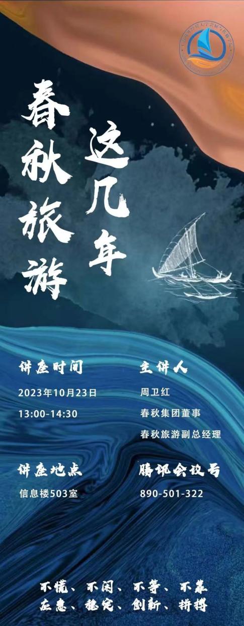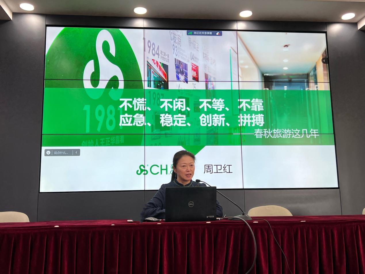 為幫助青年學生樹立遠大理想、開拓學術視野、營造良好學術氛圍、助力校園文化建設,2023年10月23日下午13:00,會展與傳播學院邀請春秋集團董事、春秋旅游副總經理周衛紅為學生帶來題為《不慌、不閑、不等、不靠、應急、穩定、創新、拼搏——春秋旅游這幾年》的主題講座。2021級旅游管理專業本科生、2023級MTA全日制研究生和部分專業教師線下參加,2023級MTA非全日制研究生線上參與。講座由會展與傳播學院高靜副教授主持。