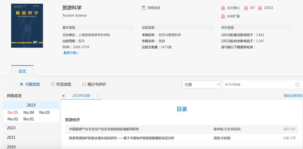 近日,我院朱妮娜博士與合作者撰寫的論文“旅游資源保護的就業增長效應研究——基于中國地市級面板數據的實證分析”由《旅游科學》在線發表。《旅游科學》(現已改為月刊)由上海市教育委員會主管,上海師范大學旅游學院和上海旅游高等專科學校主辦,是旅游管理類CSSCI期刊。