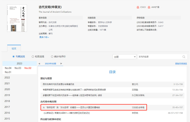 近日,我院汪世超博士作為第一作者撰寫的論文“從‘自然空間’到‘文化空間’的嬗變——亞歷山大里亞的建城史”在《古代文明》期刊在線發表。《古代文明》是由東北師范大學主管,東北師范大學世界古典文明史研究所、亞洲文明研究院、東北師范大學出版社共同主辦的CSSCI來源期刊。