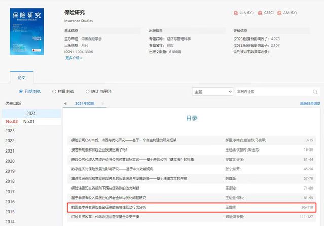 近日,我院王雪輝博士作為獨立作者的論文《我國基本養老保險基金征繳的策略性互動行為分析》在《保險研究》期刊發表。《保險研究》創刊于1980年,是國家金融監督管理總局主管的學術性保險期刊,中國保險學會會刊,也是CSSCI來源期刊。該期刊被我校認定為B2類期刊。