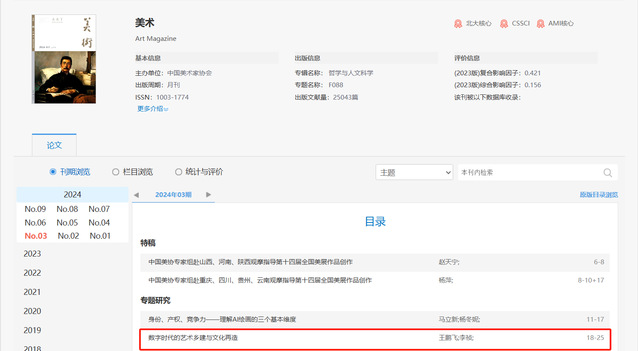 近日,我院王鵬飛博士作為第一作者的論文《數字時代的藝術鄉建與文化再造》在《美術》期刊發表。《美術》創刊于1950年,是由中國文學藝術界聯合會主管、中國美術家協會主辦的學術刊物,也是CSSCI、北大核心來源期刊。