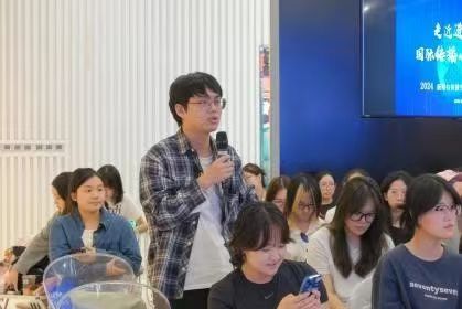 在互動環節中,現場交流氛圍濃厚。同學們紛紛提出自己對國際傳播、文化交流方面的疑惑和見解,暴劍光和蔡光瑋對同學們的問題進行了細致解答。賽時咨詢合伙人水俊婧也受邀作為嘉賓,為同學們解答了關于進博會蔬果展商、展品、會展等方面的疑慮,引發了同學們的深入思考和熱烈討論。