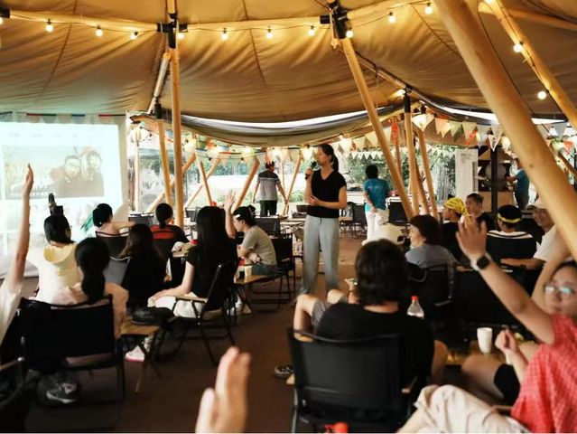 在理論講座環節中,游俠客上海分公司總經理李云子帶來了一場關于“露營+”戶外運動探索的主題講座。她通過生動的案例、詳實的數據,深入淺出地講解了戶外宿營行業的發展現狀以及面臨的挑戰。講座中,大觀園嗨king營地總經理崔連波根據自己的從業經驗,分享了營地發展的困境與發展模式。本次講座不僅拓寬了同學和老師們的行業視野,更讓大家對體育旅游產業有了更加深入和全面的理解。在互動環節,同學和老師們積極向李總和崔總提問,會場氣氛熱烈。