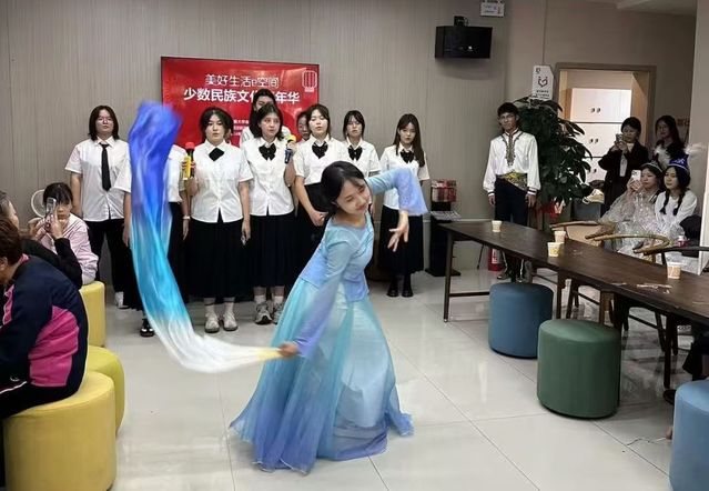 除了參與手工,居民們還近距離享受了來自維吾爾族、哈薩克族、土家族、布依族等多個民族的傳統歌舞。這些舞蹈展現了各民族獨特的藝術風格和文化魅力,精彩的舞蹈串燒還共同繪制了一幅和諧共舞的美妙圖景,表達了對多元文化的尊重和對民族團結的珍視。