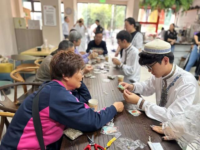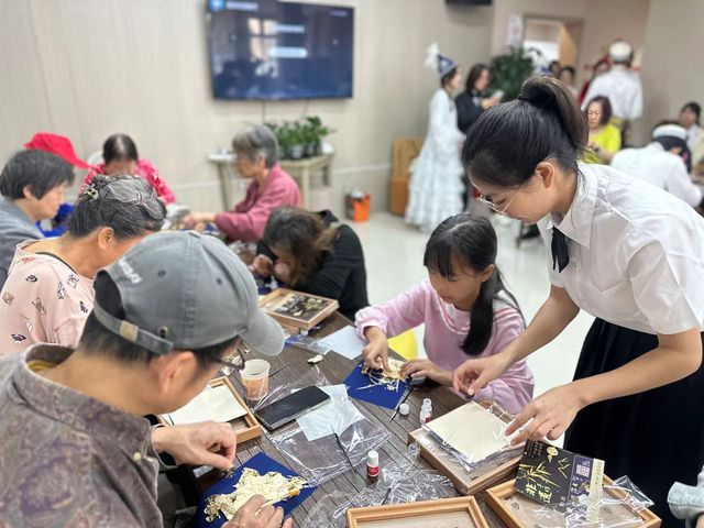 上經貿大師生團隊精心準備了非遺金箔畫和平安香囊兩項手工活動。社區居民在同學們的悉心指導下親手體驗了傳統手工藝的魅力。活動現場洋溢著溫馨與熱情,居民們專注地制作,并互相分享制作技巧,共同完成了一件件精美的手工作品。