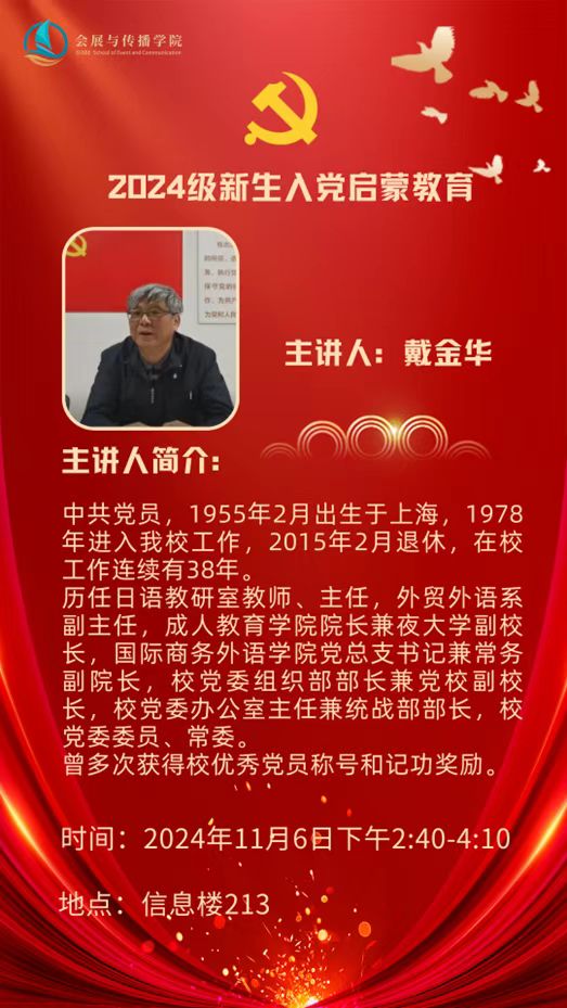 為深入學習貫徹習近平新時代中國特色社會主義思想和黨的二十屆三中全會精神,加強新生思想政治教育,引導青年積極向黨組織靠攏,11月6日,會展與傳播學院成功舉辦了新生入黨啟蒙教育活動?;顒友埿jP工委成員戴金華老師主講,全體新生輔導員、24級預科生、本科生和研究生參加。活動由學院黨委副書記(主持工作)田紀鵬主持。