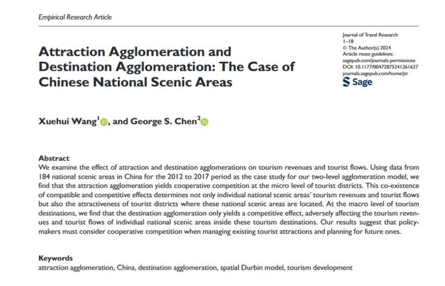 近日,我院教師王雪輝博士為第一作者的論文《Attraction Agglomeration and Destination Agglomeration: The Case of Chinese National Scenic Areas》在《Journal of Travel Research》期刊在線發表。