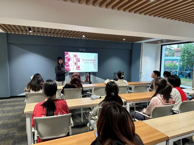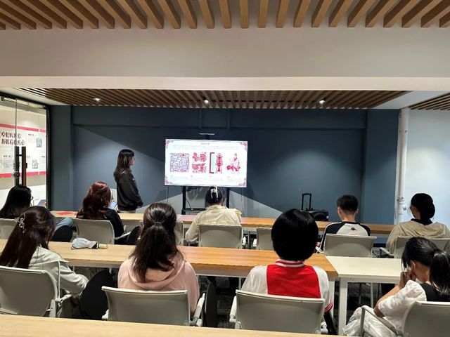 主講人首先介紹了海派剪紙的起源、發(fā)展歷程及其獨特的藝術(shù)風(fēng)格。作為上海市非物質(zhì)文化遺產(chǎn)的代表之一,海派剪紙以“海納百川”的風(fēng)格著稱,以江南百姓的生活、民風(fēng)民俗為題材,注重情境和神態(tài),通過一把剪刀、一張紅紙,將傳統(tǒng)美學(xué)與現(xiàn)代創(chuàng)意完美融合。在講解過程中,同學(xué)們感受到非遺文化的深厚底蘊,也認(rèn)識到保護和傳承非遺的重要性。