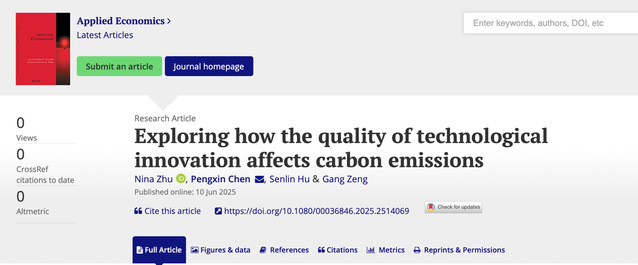 近日,會展與傳播學院朱妮娜博士作為第一作者撰寫的論文《Exploring how the quality of technological innovation affects carbon emissions》在《Applied Economics》期刊上在線發表。在中科院最新升級版分區表中,該刊屬于經濟類3區;在JCR分區中為Q2,2023年影響因子為1.8,被我校列為國際Ⅲ類期刊。
