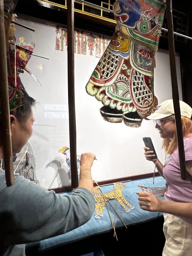 泗涇皮影戲則是一種集繪畫、雕刻、文學、音樂、表演等多種藝術形式于一體的民間戲曲藝術。它起源于清代,以其獨特的表演風格和制作工藝而著稱。學生們詳細介紹了皮影戲的制作工藝、表演方式和背后的文化故事,留學生們在學生和傳承人的指導下,親手操作皮影,體驗了一把傳統皮影戲的魅力。過程中,泗涇十錦細鑼鼓非遺傳承人彭景良和泗涇皮影戲非遺傳承人唐家昌等老藝人親臨現場,為留學生們進行了專業講解和演示,向參與者展示了非遺技藝的獨特魅力。