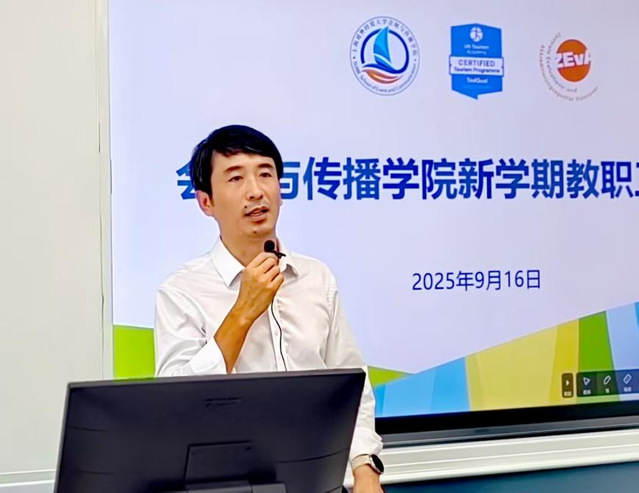 9月16日下午,會展與傳播學院在教學樓SC105召開2025-2026學年秋季學期第一次全體教職工大會,會議由學院黨委副書記(主持工作)田紀鵬主持。