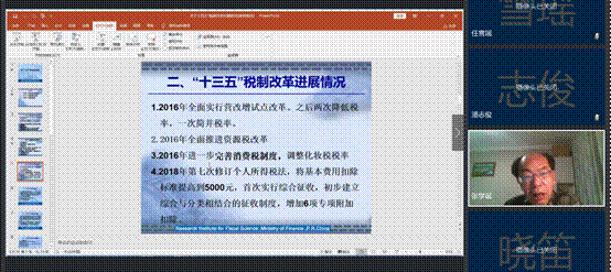 張學(xué)誕教授從“十三五”稅制改革的主要任務(wù)、進(jìn)展情況以及“十四五”稅制改革展望三個(gè)方面開展講述。首先張學(xué)誕教授根據(jù)《國(guó)民經(jīng)濟(jì)和社會(huì)發(fā)展第十三個(gè)五年規(guī)劃綱要》中所確定稅制改革的主要內(nèi)容提出當(dāng)前我國(guó)稅制改革的主要任務(wù)包含增值稅、消費(fèi)稅、資源稅等改革,逐步擴(kuò)大征稅范圍;清理規(guī)范行政事業(yè)性收費(fèi),開征環(huán)境保護(hù)稅,完善地方稅體系,推進(jìn)房地產(chǎn)稅立法;推進(jìn)非稅收入管理改革,;深化國(guó)稅、地稅征管體質(zhì)改革,完善稅收征管方式,提高稅收征管效能,推行電子發(fā)票。接下來(lái)張學(xué)誕教授結(jié)合我國(guó)當(dāng)前實(shí)際情況詳細(xì)講解了當(dāng)前我國(guó)稅制改革的進(jìn)展情況,分別從從稅率、稅基、稅種多方面進(jìn)行分析。最后根據(jù)以上分析開展對(duì)“十四五”稅制改革的相關(guān)建議的講解,張學(xué)誕教授依據(jù)“十四五”規(guī)劃建議中對(duì)稅制改革的表述,對(duì)其中的增值稅、個(gè)人所得稅以及房產(chǎn)稅進(jìn)行了詳細(xì)的講述,并在最后引出了三個(gè)有關(guān)問(wèn)題:提高直接稅比重、健全地方稅體系、下放地方稅收管理權(quán)限,讓同學(xué)們自己思考。講解結(jié)束后,張學(xué)誕教授還與同學(xué)們積極互動(dòng),針對(duì)同學(xué)們提出的關(guān)于稅制改革的問(wèn)題進(jìn)行了解答。