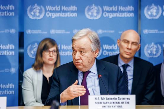 2020年2月24日,聯合國秘書長古特雷斯(前)在瑞士日內瓦世界衛生組織總部發表講話。古特雷斯表示,中國實施嚴格的防控措施,以犧牲正常生活的方式為全人類作出了貢獻。古特雷斯當日造訪日內瓦世衛組織總部,并與世衛組織各部門負責人舉行座談。新華社發