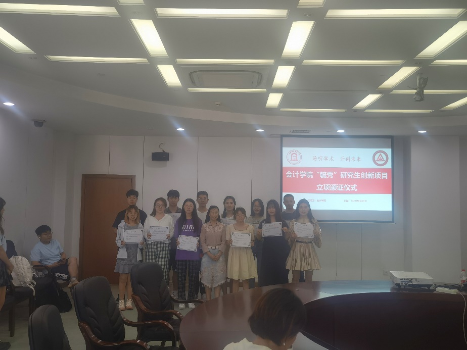隨后,會議舉行了會計學院“毓秀”科研創新項目立項儀式。楊慧輝副院長為獲得立項的項目負責人,頒發了立項證書。此次學院“毓秀”科研創新項目,充分考慮學碩、專碩不同研究生群體的科研愿景,分類設立高標準的結項標準。經學生自主申報、導師嚴格審核并推薦,學院組織校外專家雙盲評審后,擇優立項資助15個項目。