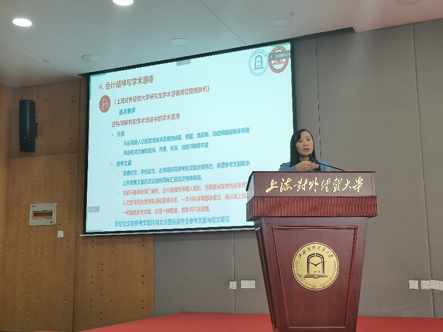 楊慧輝以中概股的兩次信任危機反思為引,就會計精神中不可或缺的誠信品格,重點結合研究生的科學研究活動強調了學術誠信是學術創新的基石。她通過現實中一些碩士研究生學術不端的多個典型案例,分別從國內外兩個視角詳細地剖析了學術不端的定義、形式以及常見做法,并深入講解了對于學術不端的相應處罰措施,進而強調作為研究生應當深刻認識到學術規范、科研誠信的重要性,在科學研究和學術活動中要追求科研真理,恪守學術道德,用實際行動踐行在新生開學典禮上作為會計人的誠信宣誓。