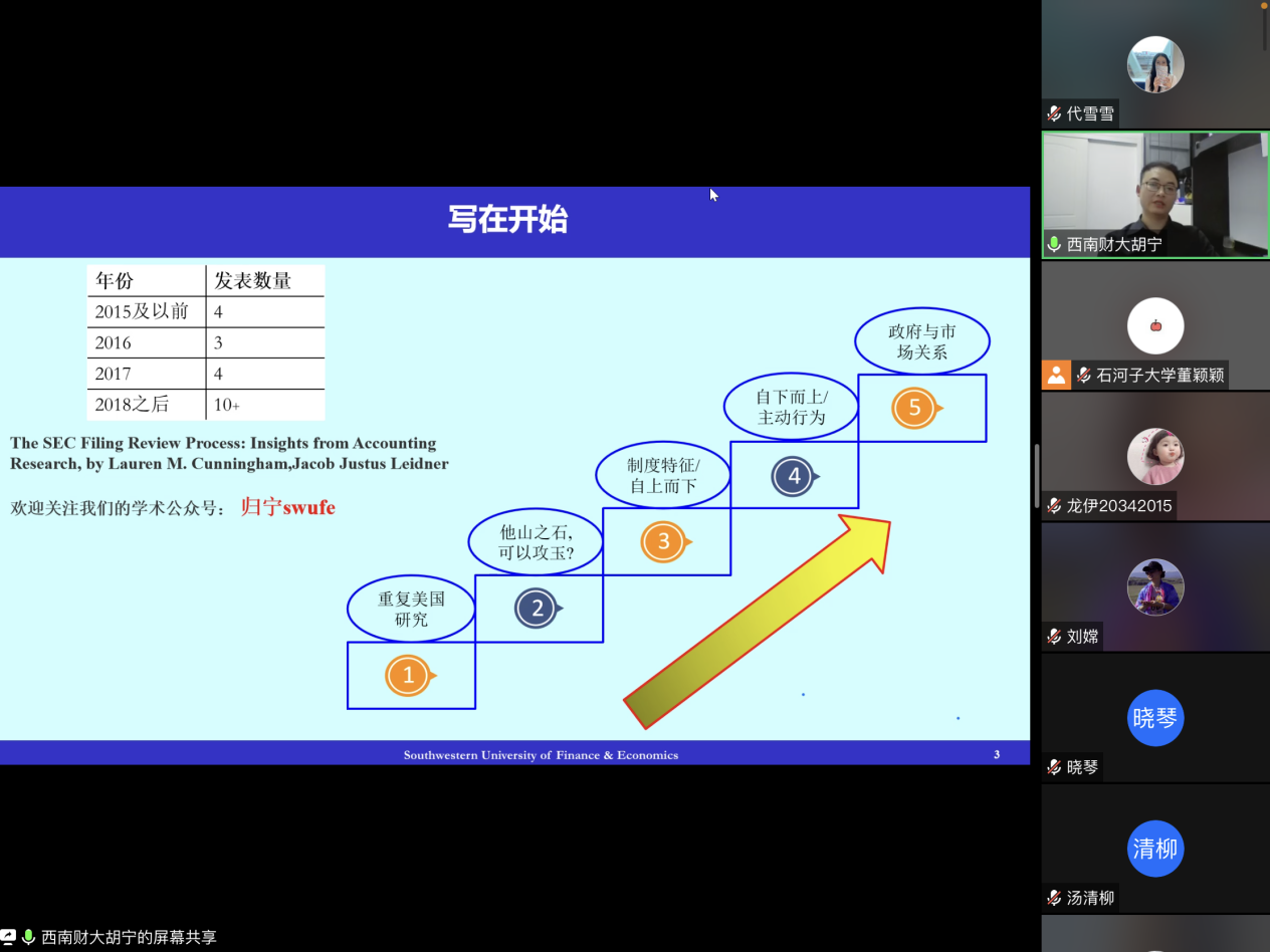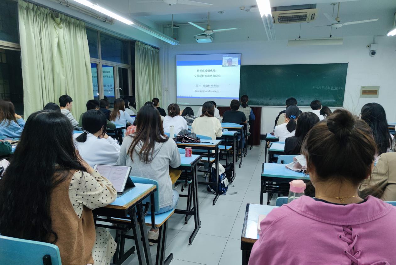 10月26日晚,西南財經大學會計學院胡寧副教授通過騰訊會議面向我院2021級研究生新生開展了一場主題為“橫看成嶺側成峰:中國交易所問詢函系列研究”的學術講座。學院2021級全日制研究生在學思樓C208、非全日制研究生在云端,共同聆聽了這場講座。
