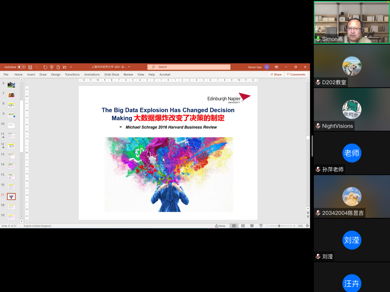 10月13日晚上,愛丁堡龍比亞大學(xué)商學(xué)院高善生教授在英國蘇格蘭的愛丁堡通過騰訊會(huì)議面向我院2021級(jí)研究生新生開展了一場主題為“大數(shù)據(jù)時(shí)代會(huì)計(jì)的發(fā)展與未來就業(yè)思考”的學(xué)術(shù)講座。學(xué)院2021級(jí)全日制研究生在學(xué)思樓C202、非全日制研究生在云端,共同聆聽了這場講座。