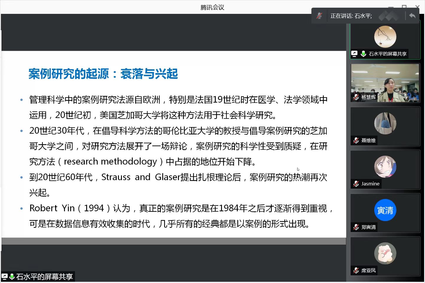 11月15日晚上,會計學院舉辦了“MPAcc案例開發工作坊”第二期培訓,學院邀請了暨南大學管理學院教授石水平通過騰訊會議面向我院師生開展了一場主題為“案例研究和開發:基于國際視角與中國背景”的講座。學院2021級研究生在學思樓D202,學院其他師生、學校MBA研究生、以及包括華東政法大學、上海國家會計學院、華東理工大學等多家兄弟院校的研究生在云端,共同聆聽了這場講座,實現優質資源共享。會計學院副院長楊慧輝教授主持了本次工作坊。