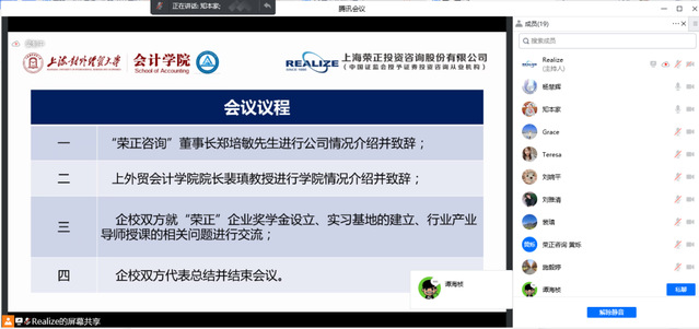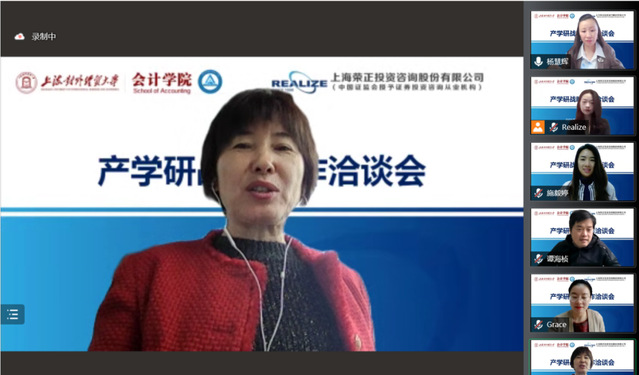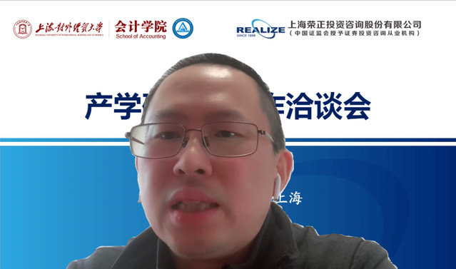 4月1日下午,會計學院與上海榮正投資咨詢股份有限公司共同舉行線上產學研戰略合作洽談會。會計學院院長裴瑱、副院長楊慧輝、黨委副書記施毅婷、MPAcc中心副主任譚海楨、研究生輔導員朱紅艷,上海榮正投資咨詢股份有限公司董事長兼首席合伙人鄭培敏以及總裁辦、人力資源部、咨詢業務部的工作人員出席了本次合作洽談會。