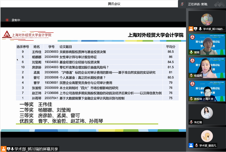 最后,會計學院院長裴瑱宣布了本次大賽的評選結果并進行了總結致辭。在本次會院論壇中,2020級審計學專業研究生王偉佳同學的《關聯券商股權質押與基金投資決策》一文以最高分榮獲一等獎,楊娜娜、劉瑩閣兩位同學榮獲二等獎,房彥齡、孟昊、曾可三位同學榮獲三等獎。