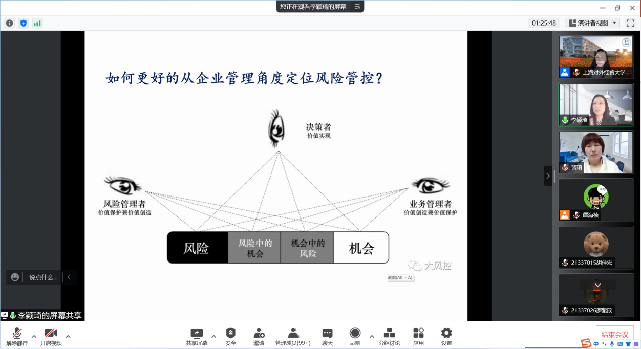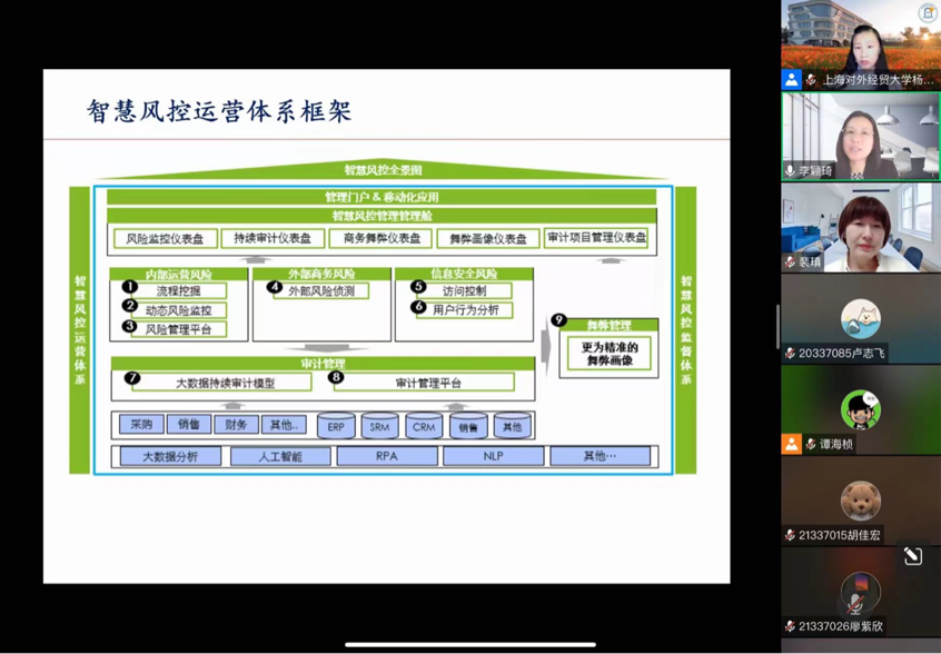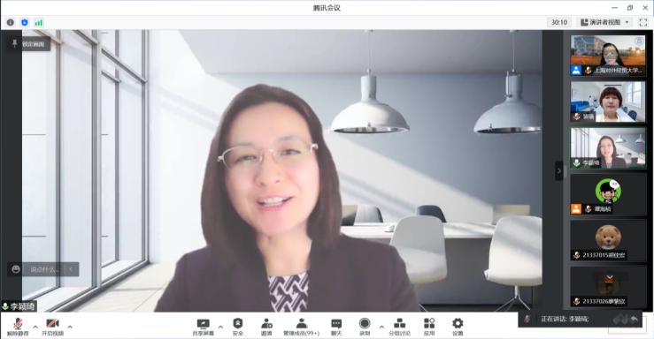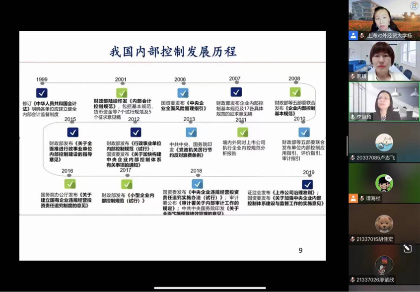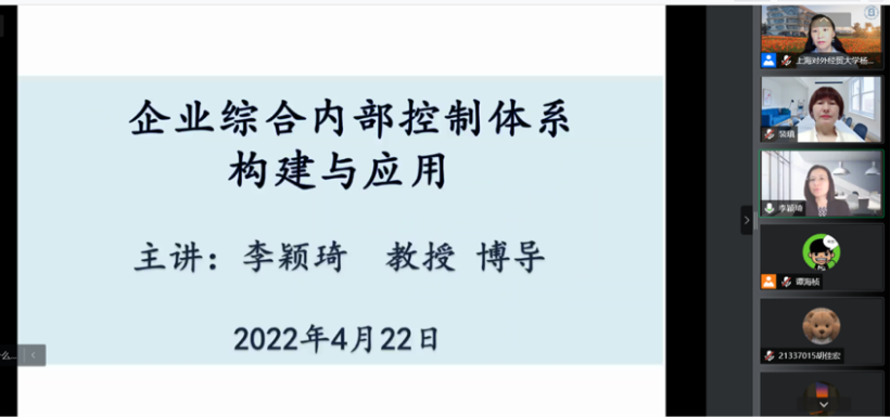 4月22日晚,學院特邀全國會計領軍人才、財政部內部控制標準委員會咨詢專家、中國會計學會內部控制專業委員會委員、中國醫藥會計學會學術委員會副主任、上海國家會計學院審計系主任、醫院運營管理研究中心主任李穎琦教授通過騰訊會議為學院研究生開展了主題為“企業內部控制綜合體系構建與應用”的學術講座。會計學院院長裴瑱教授對李穎琦教授為我院研究生開設前沿講座表示感謝和歡迎,并介紹了李教授的基本情況。