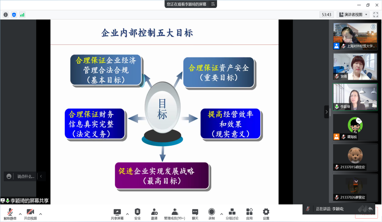 講座伊始,李教授由“曲突徙薪”的成語典故引出內部控制的重要性和必要性;接下來,細致梳理了我國內部控制制度的發展歷程,并對企業內部控制的體系和五大目標進行了詳細解讀。她闡述了企業內部控制五大目標的內在聯系,基本目標是合理保證企業經濟管理合法合規,重要目標是合理保證資產安全,法定義務是合理保證財務信息真實完整,現實意義是提高經營效率和效果,最高目標是促進企業實現發展戰略。