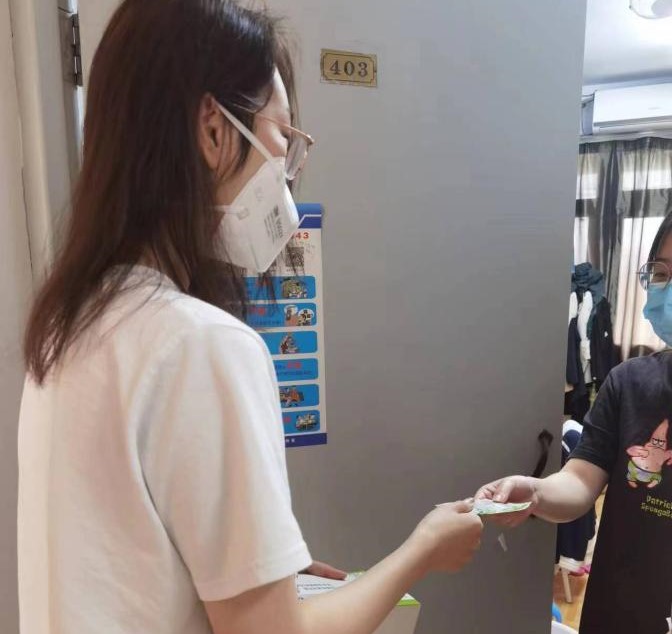 支部黨員陸名一作為30號樓的臨時團支書,積極參加學校社區(qū)的多項抗疫志愿服務(wù)。晚上領(lǐng)取好抗原試劑,早上一一敲門喊醒同學發(fā)放抗原試劑;核酸檢測時協(xié)助維持排隊秩序,防止錯管;盡心盡責守好宿舍樓的出入口提醒同學不要忘記登記掃碼。參加志愿活動已經(jīng)快要兩個月了,她深刻體會了“奉獻、友愛、互助、進步”的志愿者精神。