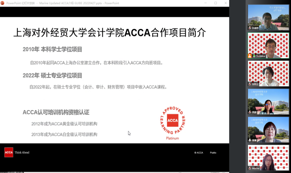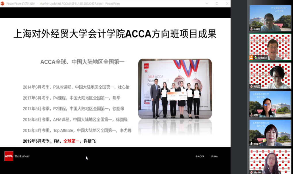 4月27日,裴瑱院長、孫淑偉副院長、吳蔚老師、曹亞楠老師以及ACCA華中地區負責人朱曉云女士等召開線上ACCA項目合作溝通會議。朱曉云女士主持了會議。ACCA上海辦公室的Marine女士率先介紹了ACCA在全球和在中國的發展歷史與現狀,目前ACCA在中國已有會員和學員近19000人,認可雇主涵蓋外企、國企、民企350余家,目前已是在全球認可度很高的專業組織機構。