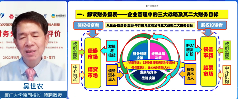 講座伊始,吳世農教授從企業、投資者、監管部門、中介這四個角度闡述了公司管理中的三大戰略及其二大財務目標,指出企業財務管理內部目標的重要性;接下來,吳教授引入資產負債表、利潤表以及現金流量表,細致解讀了三大報表的基本架構及其要素內涵,進一步分析資本、資產、收入、利潤以及現金之間的關系。吳教授提出“現金為王,經營活動凈現金為王中王”的觀點,指出企業經營活動凈現金一定要比凈利潤大,從而保障企業資金鏈安全,實現企業價值最大化。