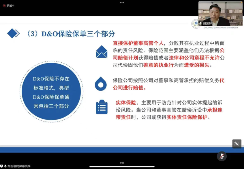 5月13日晚,學(xué)院全體研究生通過云端聆聽了由浙江工商大學(xué)會計(jì)學(xué)院院長胡國柳教授帶來的主題為“董事高管責(zé)任保險(xiǎn):理論研究與中國實(shí)踐”的精彩的學(xué)術(shù)報(bào)告。胡國柳教授為財(cái)政部“會計(jì)名家培養(yǎng)工程”入選者,“百千萬人才工程”國家級人選、國家“有突出貢獻(xiàn)中青年專家”、享受“國務(wù)院政府殊津貼”專家、教育部“新世紀(jì)優(yōu)秀人才支持計(jì)劃”入選者、“寶鋼優(yōu)秀教師獎(jiǎng)”獲得者。擔(dān)任教育部高等學(xué)校工商管理類專業(yè)教學(xué)指導(dǎo)委員會會計(jì)學(xué)專業(yè)教學(xué)指導(dǎo)分委員會委員、中國會計(jì)學(xué)會財(cái)務(wù)管理專業(yè)委員會會員。
