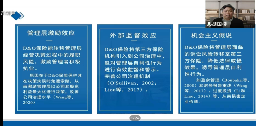講座伊始,胡教授闡述了“董事高管責(zé)任保險(xiǎn)”的起源、定義、需求動因、以及治理效應(yīng)。他指出,學(xué)術(shù)界對需求動因的理論研究主要基于管理者風(fēng)險(xiǎn)厭惡假說、股東利益保護(hù)假和企業(yè)財(cái)務(wù)成本假說三個(gè)方面,對治理效應(yīng)的理論研究則是基于管理層激勵(lì)效應(yīng)、外部監(jiān)督效應(yīng)和機(jī)會主義假說。