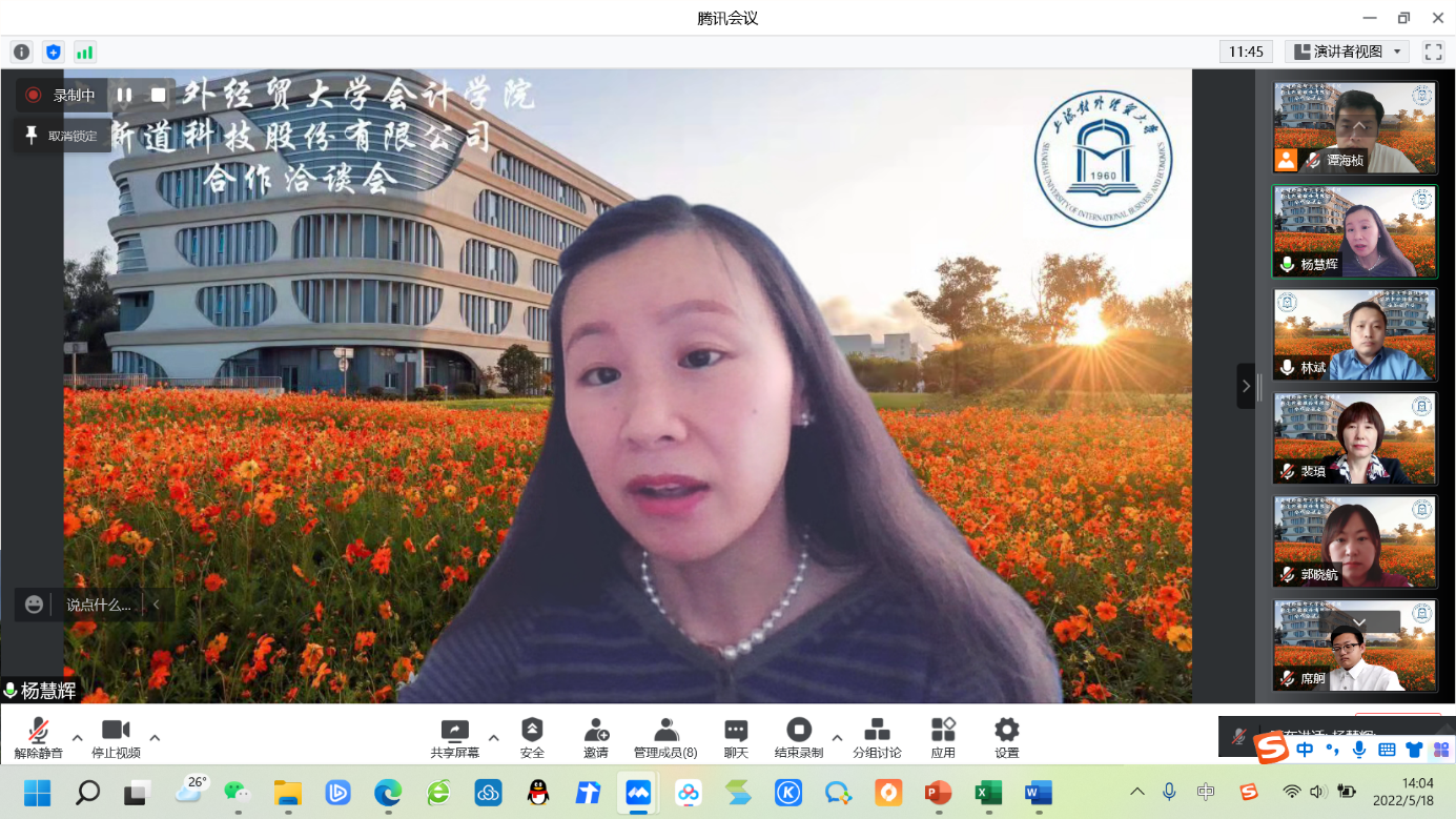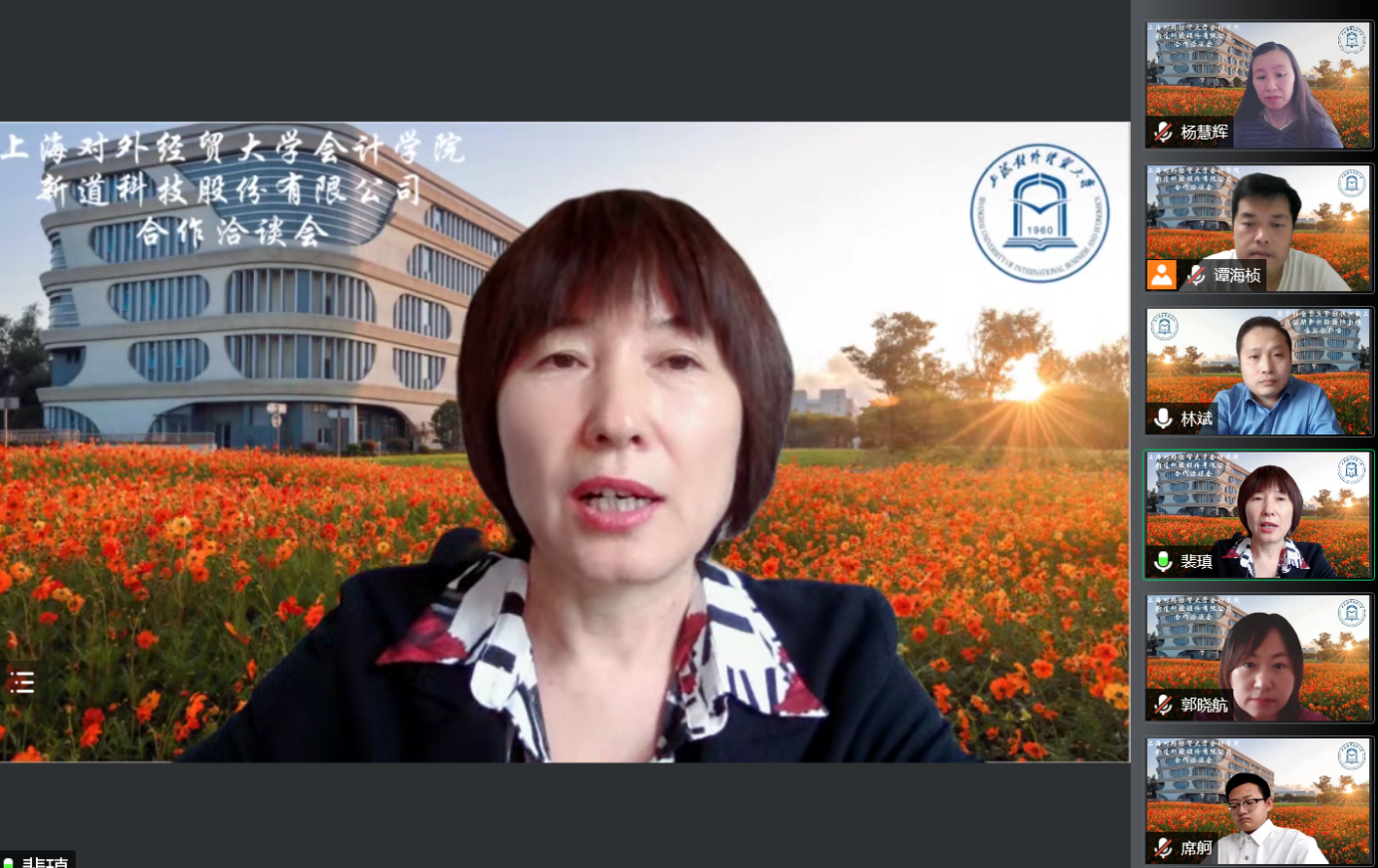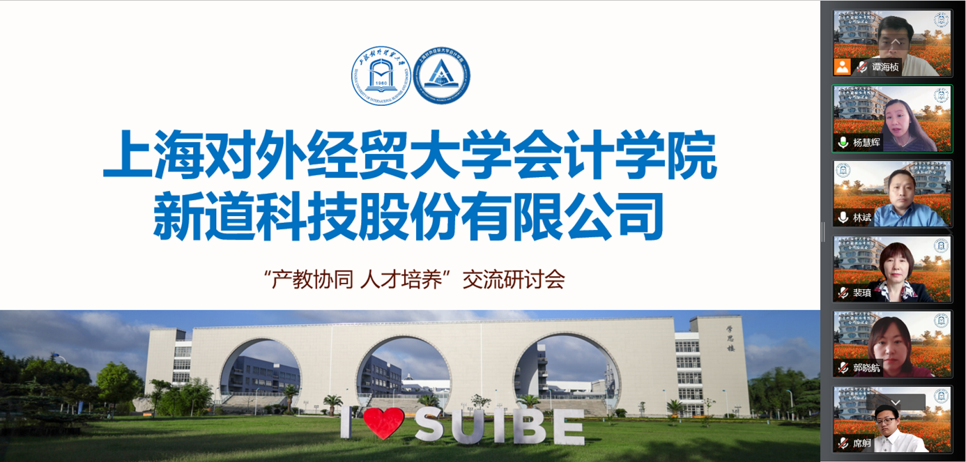 為貫徹落實黨中央、國務院關于高校畢業生就業工作的決策部署,落實教育部關于全國高校書記、校長訪企拓崗促就業專項行動,落實學校關于開展院長、書記訪企拓崗促就業專項行動的通知,深入落實學院就業工作“一把手”工程;同時,按照財政部《會計改革與發展“十四五”規劃綱要》做好人才培養共工作。會計學院于518日,邀請新道科技有限進行了在線洽談,雙方就深化產教融合、做好財會課程改革、協助教師科研實訓、推動學生就業展開商討。新道科技股份有限公司上海區總經理林斌、江南區副總經理錢麗、新道北京總部商科專家張娜娜、上海校企合作經理郭曉航、教學顧問劉玉、售前顧問席舸,會計學院院長裴瑱教授、副院長楊慧輝教授、MPAcc中心副主任/輔導員譚海楨出席了本次合作洽談會。