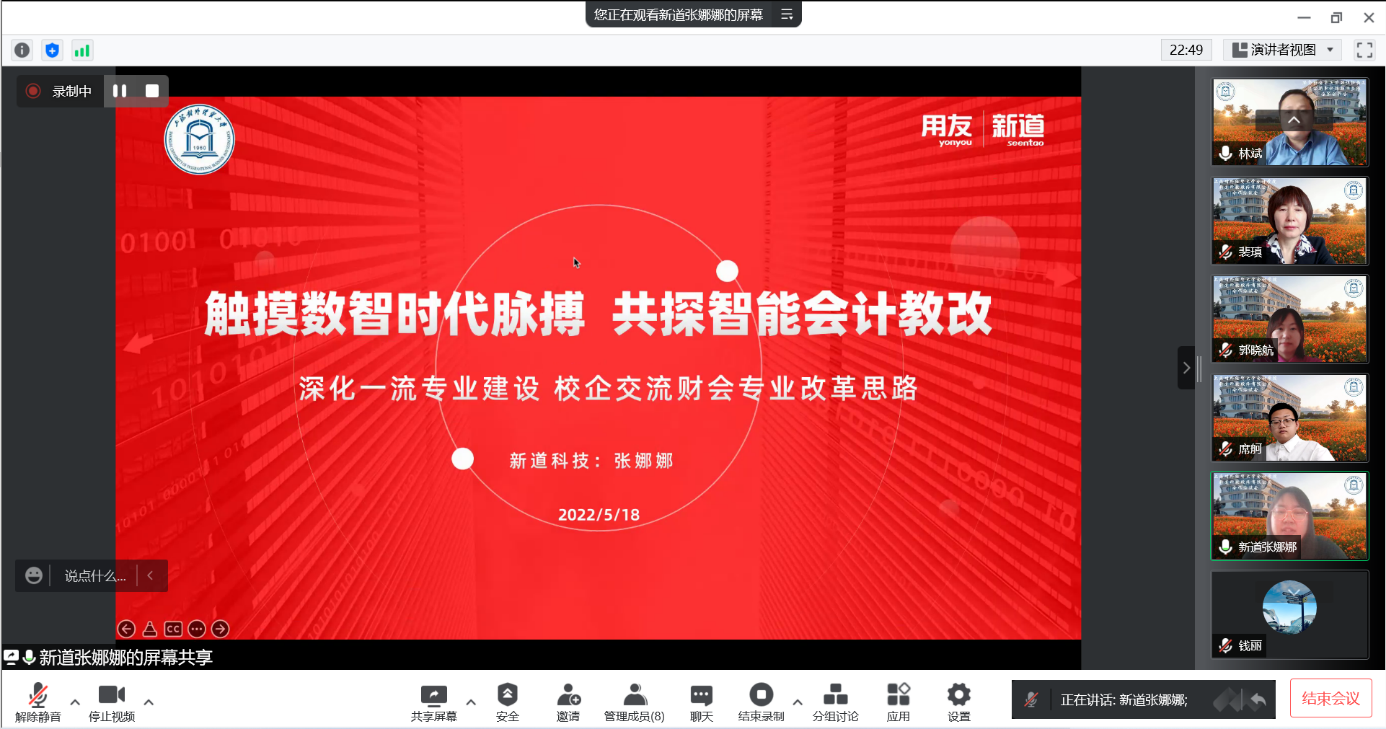 新道北京總部商科專家張娜娜以《觸摸時代脈搏,共探智能會計教改》為題,做了交流分享。在分享中,她從新道科技已經開展的合作案例、業務板塊、自有課程體系和技術能力,就數智內涵的財務課程體系、財務人才培養、畢業生就業素質要求等做了展示,從進行數智+專業的課程融合、數智場景+學習環境的融合、教研+產業的虛擬實驗室建設、“雙元雙能”師資融合與培訓等產學研合作提出了有益建議。