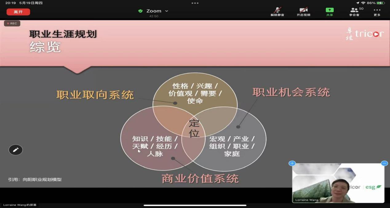 講座伊始,王艷女士從影響世界格局變化的五大因素開始,指出當今社會各行各業變動迅速、就業環境變化多端,作為財會人員不能僅僅只滿足于會計細節,而應將自己置身于宏觀大環境,不斷推動自己去了解業務流程和企業發展基本面。接著,王女士闡述了如何用向陽職業規劃模型來做出自己的未來規劃,該模型要求我們兼顧職業取向、商業價值和職業機會這三大因素,找出其中的交集,即最優質的職業規劃。其中,王艷女士引用了CSRI對于Y22的六個趨勢的研究報告,闡述了就業宏觀背景下勞動力與資源的稀缺,指出當今社會就業壓力之大,就業人才不僅要具備良好的專業素質,還應該提升對于信息技術和數據技術的敏感。