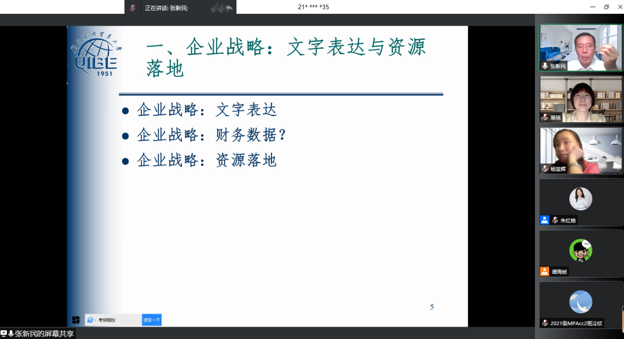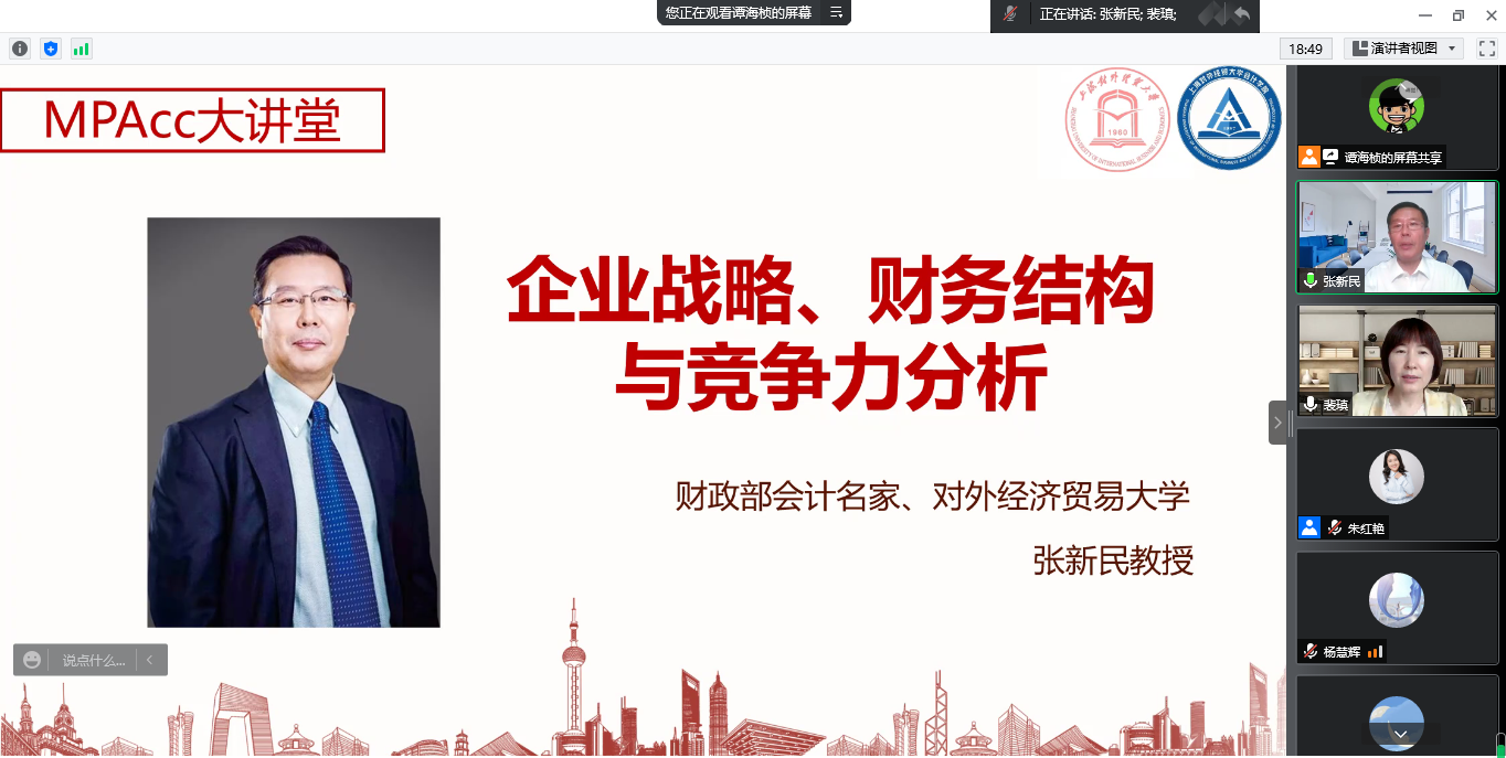 5月25日,會計學院特邀對外經濟貿易大學原副校長、國際商學院原院長、財政部會計名家張新民教授,通過騰訊會議為全校師生開展了主題為“企業戰略、財務結構與競爭力分析”主題講座。會計學院院長裴瑱教授對張新民教授的到來表示感謝和歡迎,并為在場師生介紹了張教授的基本情況。
