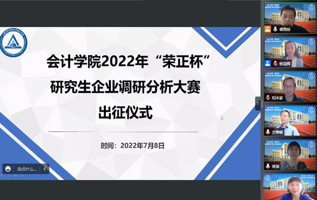 7月8日下午,會計學(xué)院2022年“榮正杯”研究生企業(yè)調(diào)研分析大賽出征儀式在云端成功舉辦。上海榮正投資咨詢股份有限公司創(chuàng)始人、董事長兼首席合伙人鄭培敏先生,榮正咨詢資深合伙人、常務(wù)副總經(jīng)理方攀峰先生,學(xué)校辦公室主任、會計學(xué)院黨委書記張嶸老師,會計學(xué)院院長裴瑱教授,副院長楊慧輝教授,黨委副書記施毅婷以及各支參賽隊(duì)伍的指導(dǎo)老師和隊(duì)員共同出席了此次出征儀式。出征儀式由會計學(xué)院MPAcc教育中心副主任譚海楨主持。