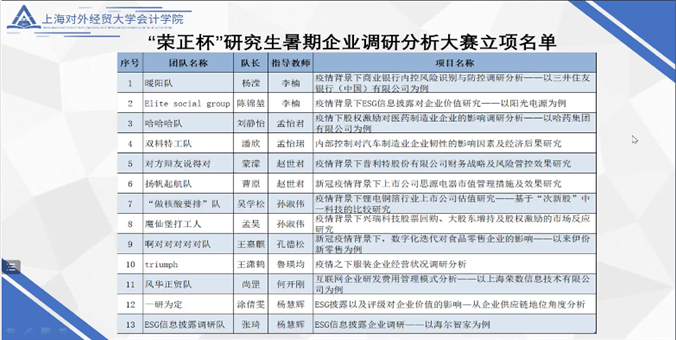 會計學(xué)院副院長楊慧輝教授向與會嘉賓介紹了本次“榮正杯”研究生企業(yè)調(diào)研分析大賽的啟動背景、報名參賽、評審立項(xiàng)的情況。為發(fā)揮實(shí)踐育人在研究生創(chuàng)新人才培養(yǎng)中的積極作用,培養(yǎng)和增強(qiáng)研究生的創(chuàng)新意識和發(fā)現(xiàn)、分析、解決企業(yè)實(shí)際問題的應(yīng)用創(chuàng)新能力和實(shí)踐能力,在作為會計學(xué)院產(chǎn)學(xué)研基地之一的上海榮正投資咨詢股份有限公司大力支持下,學(xué)院研究生暑期企業(yè)調(diào)研分析大賽啟動。自5月中旬發(fā)布大賽申報通知以來,共有20多支隊(duì)伍共百余名研究生積極報名,最終經(jīng)過綜合評選,13支參賽隊(duì)伍入選,參與研究生達(dá)70余名。
