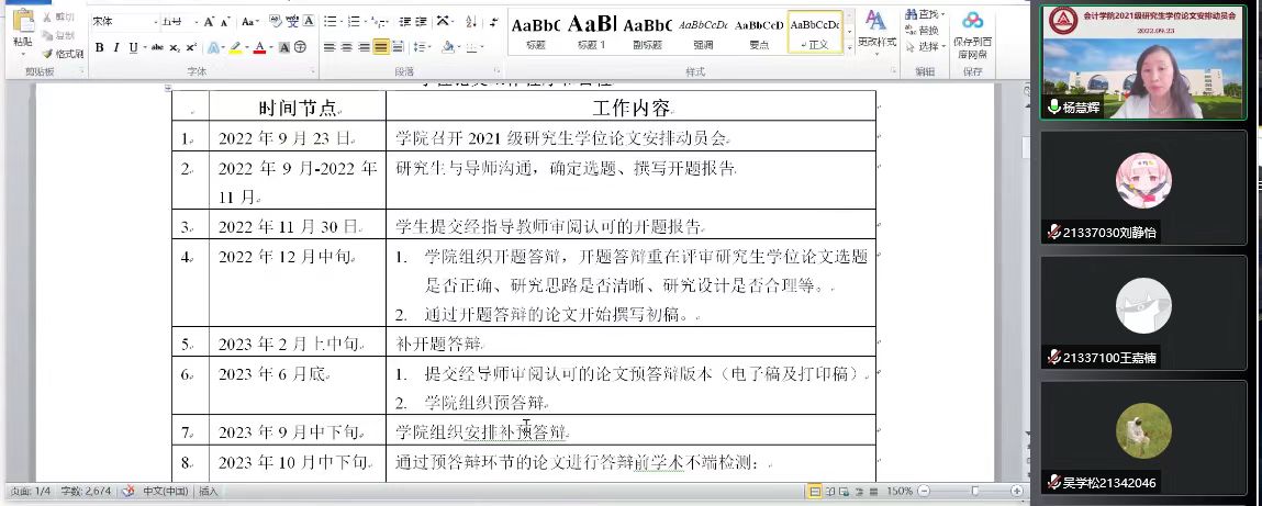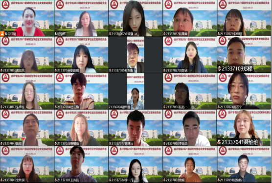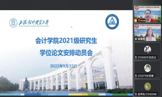 楊慧輝教授向2021級研究生詳細解讀了《上海對外經貿大學會計學院碩士學位論文質量管理辦法(試行)》,梳理了學院關于2021級碩士研究生學位論文的工作程序和日程安排,并對研究生開展了關于學術道德與學術規范教育。她希望同學們樹立正確的學術道德價值觀,將一絲不茍、嚴謹治學的求實精神發揚在學位論文選題、撰寫的全過程,強調學位論文應當緊貼專業和研究方向,要突出問題意識,注重選題基于國家戰略需求和社會關切、研究設計的科學性、行文的學術規范性;同時還要在學位論文的撰寫中注意把控好各個時間節點,合理做好時間規劃,以知促行,以行促知,打磨出一篇經得起檢驗的高質量碩士學位論文。
