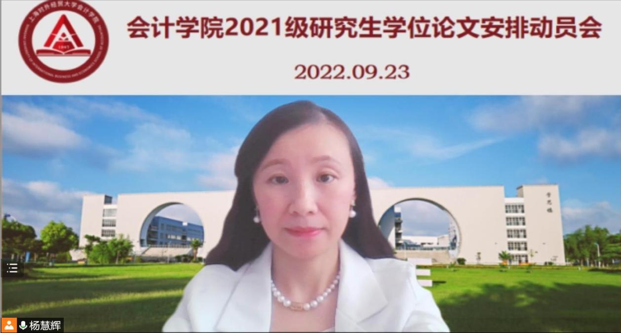 楊慧輝教授向2021級研究生詳細解讀了《上海對外經(jīng)貿(mào)大學(xué)會計學(xué)院碩士學(xué)位論文質(zhì)量管理辦法(試行)》,梳理了學(xué)院關(guān)于2021級碩士研究生學(xué)位論文的工作程序和日程安排,并對研究生開展了關(guān)于學(xué)術(shù)道德與學(xué)術(shù)規(guī)范教育。她希望同學(xué)們樹立正確的學(xué)術(shù)道德價值觀,將一絲不茍、嚴謹治學(xué)的求實精神發(fā)揚在學(xué)位論文選題、撰寫的全過程,強調(diào)學(xué)位論文應(yīng)當(dāng)緊貼專業(yè)和研究方向,要突出問題意識,注重選題基于國家戰(zhàn)略需求和社會關(guān)切、研究設(shè)計的科學(xué)性、行文的學(xué)術(shù)規(guī)范性;同時還要在學(xué)位論文的撰寫中注意把控好各個時間節(jié)點,合理做好時間規(guī)劃,以知促行,以行促知,打磨出一篇經(jīng)得起檢驗的高質(zhì)量碩士學(xué)位論文。