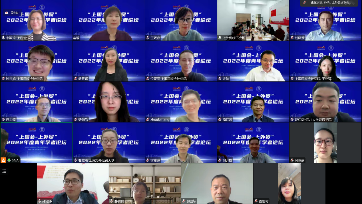 在黨的二十大勝利閉幕之際,為學習貫徹黨的二十大精神,促進會計審計學科領(lǐng)域的青年學者學術(shù)交流,11月11日,上海對外經(jīng)貿(mào)大學會計學院與上海國家會計學院教研部聯(lián)合舉辦2022年度青年學者論壇,來自兩校的青年學者進行學術(shù)論文報告,校內(nèi)外專家進行論文點評。上海對外經(jīng)貿(mào)大學會計學院院長裴瑱教授和上海國家會計學院教研部執(zhí)行主任劉鳳委教授出席活動并致辭。上海對外經(jīng)貿(mào)大學會計學院副院長張?zhí)焓娼淌凇⒏痹洪L楊慧輝教授、副院長孫淑偉副教授,上海國家會計學院會計系主任宋航教授、審計系主任李穎琦教授,以及來自兩校的100余位師生出席論壇,論壇由李穎琦教授主持。