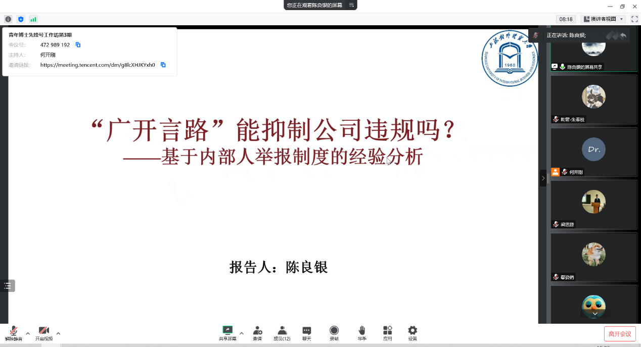 主講人陳良銀博士在會議中報告的論文題目是:“廣開言路”能抑制公司違規嗎?—— 基于內部人舉報制度的經驗分析。陳良銀博士從研究動機、研究貢獻、內部人舉報制度、研究假說、研究設計、實證結果、橫截面檢驗、進一步分析和穩健性檢驗九個方面展開論述,借助于中國資本市場的研究場景,從企業內部機制設計的視角考察作為企業內部信息傳遞機制的內部人舉報制度對公司違規行為的影響。