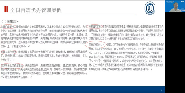 李遠勤教授首先從“評審如何判斷高質量教學案例”的角度出發,就全國百篇優秀管理案例的評審要求,如案例征文的撰寫規范、案例使用說明的邏輯進行詳細介紹;并將中國工商管理國際案例庫中高質量教學案例的評審維度與標準,結合具體案例情況逐一說明。同時,李遠勤教授結合最佳實踐案例與教學案例的比較分析,進一步講授教學案例在具體設計撰寫中需具備的特點與考慮要求。