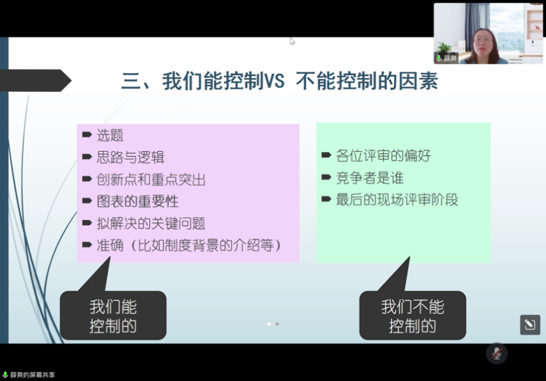最后,薛爽老師向我院教師們列舉了在項目申請中的可控與不可控因素,鼓勵教師們大膽嘗試,做自己感興趣的研究,為學校的科研建設添磚加瓦。