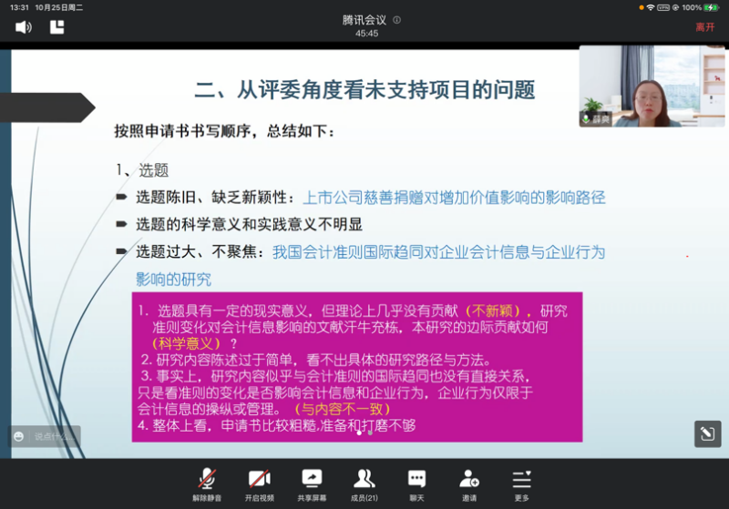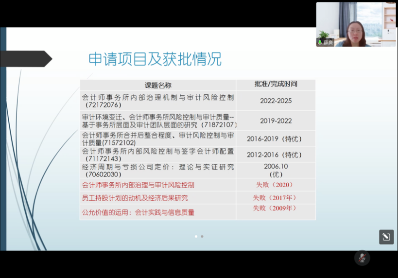 首先,薛爽老師分別講了她國自科基金申請的成功與失敗經驗,逐條分析了各個項目的評審意見。薛爽以自己成功立項的國家自科面上項目《會計師事務所合并后的整合程度、審計風險控制與審計質量》為例,指出課題需要選取緊跟時事的題目,題材需新穎并能體現較高的研究價值,同時具備扎實的前期研究基礎,強化對關鍵問題的描述。