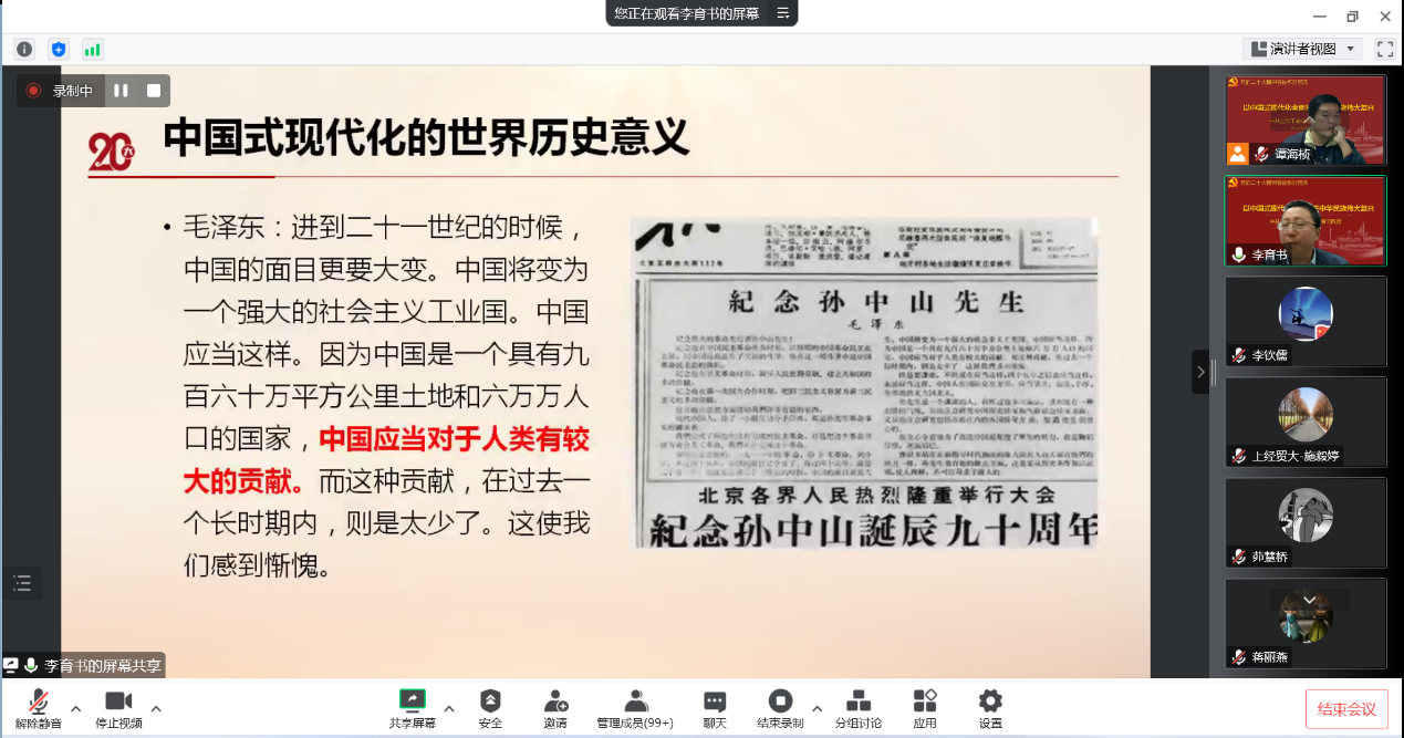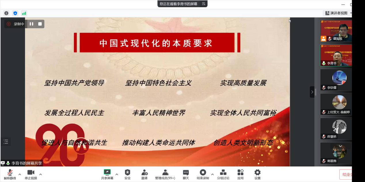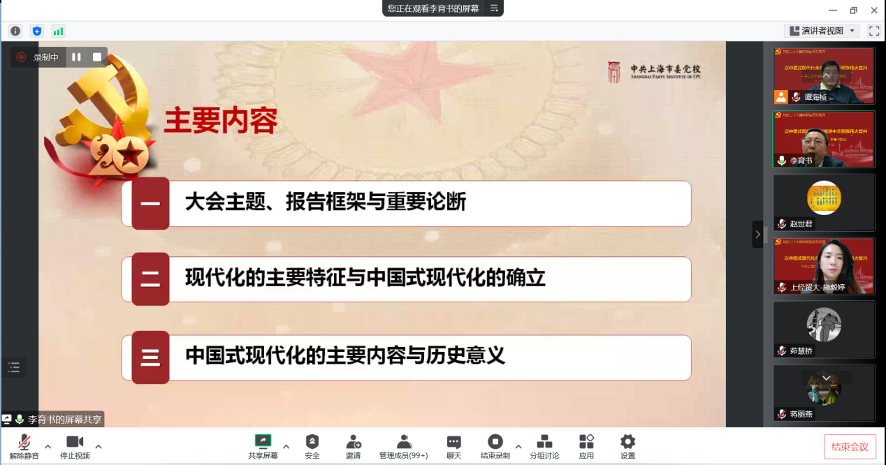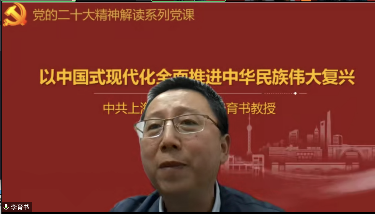 12月5日晚六點,會計學院進行了“乘風破浪,守正創新 ”——會計學院黨員師生二十大學習系列專題報告聽講活動第二場主題報告。活動邀請了中共上海市委黨校馬克思主義實踐哲學研究中心主任、哲學部碩士研究生導師李育書教授,為學院師生做了《以中國式現代化全面推進中華民族偉大復興——黨的二十大精神學習交流》的在線報告。會計學院各教工支部黨員、學生支部黨員、入黨積極分子和入黨申請人參與聆聽,本次講座由會計學院黨委副書記施毅婷主持。