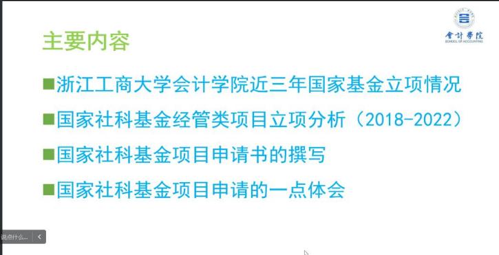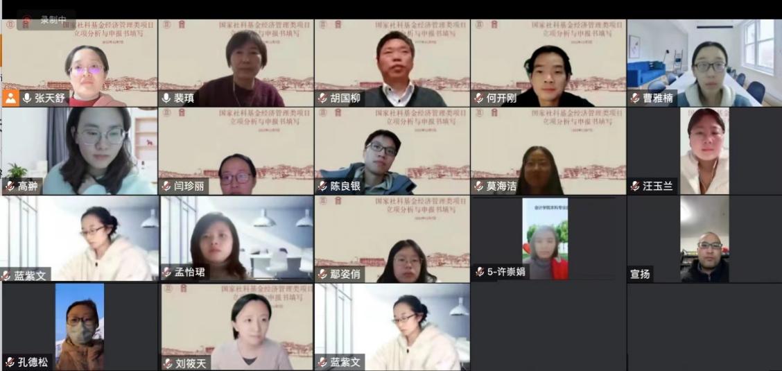 為推動(dòng)科研高質(zhì)量發(fā)展,會(huì)計(jì)學(xué)院邀請(qǐng)浙江工商大學(xué)會(huì)計(jì)學(xué)院院長(zhǎng)胡國(guó)柳教授,為我院教師進(jìn)行國(guó)家社科基金經(jīng)濟(jì)類(lèi)項(xiàng)目申報(bào)的分享。講座于12月7日19:00在線進(jìn)行。本次講座由副院長(zhǎng)張?zhí)焓?/span>教授主持,學(xué)院青年教師參會(huì)聆聽(tīng)。
