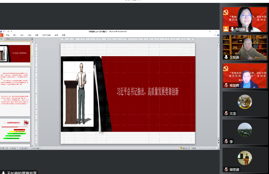 王如燕老師圍繞習(xí)主席講話中的“高質(zhì)量發(fā)展要靠創(chuàng)新”,結(jié)合自己教授的《風險管理》課程為大家分享了她對二十大報告精神的領(lǐng)會,她認為,高質(zhì)量發(fā)展要鋪好軌道才能創(chuàng)新,國有企業(yè)發(fā)揮著頂梁柱的作用,要深化國有企業(yè)的改革,做好風險管控。王老師從國企風險管理的角度分析了企業(yè)如何完善、健全和執(zhí)行內(nèi)部控制,如何加強制度建設(shè),實現(xiàn)風險管控。王老師的黨課生動有趣,用“許元稱釘”的民間典故和國外金剛砂空中貨物公司“一條橫線”的故事介紹預(yù)算控制的重要性,黨建與專業(yè)有效結(jié)合。