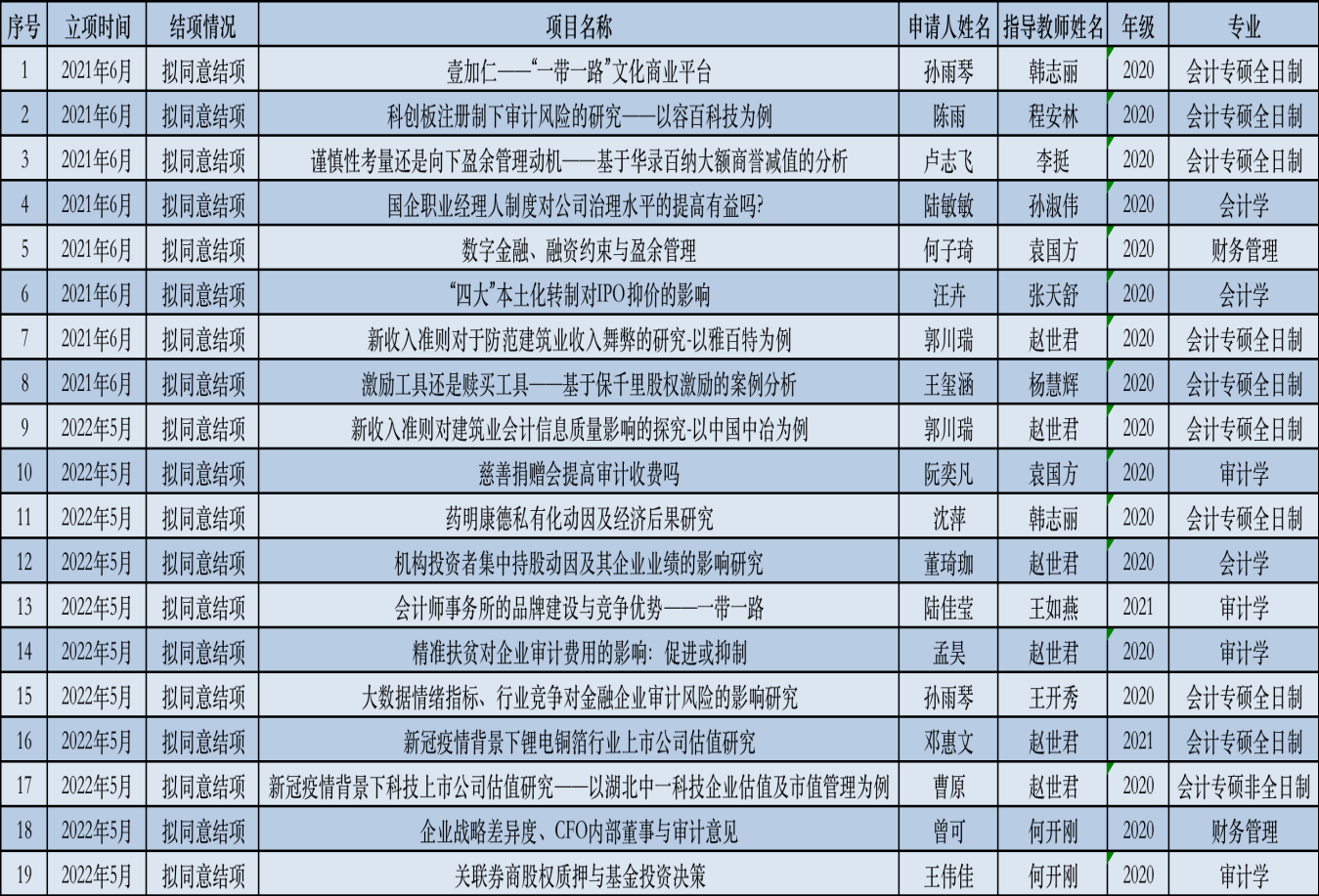 按照我院《關于會計學院2021-2022年“毓秀計劃”研究生創新項目結項通知》和《會計學院“毓秀”研究生創新項目資助計劃實施辦法》,經項目申請人提交結項材料,學院組織校外專家進行雙盲評審,擬結項以下19個項目: