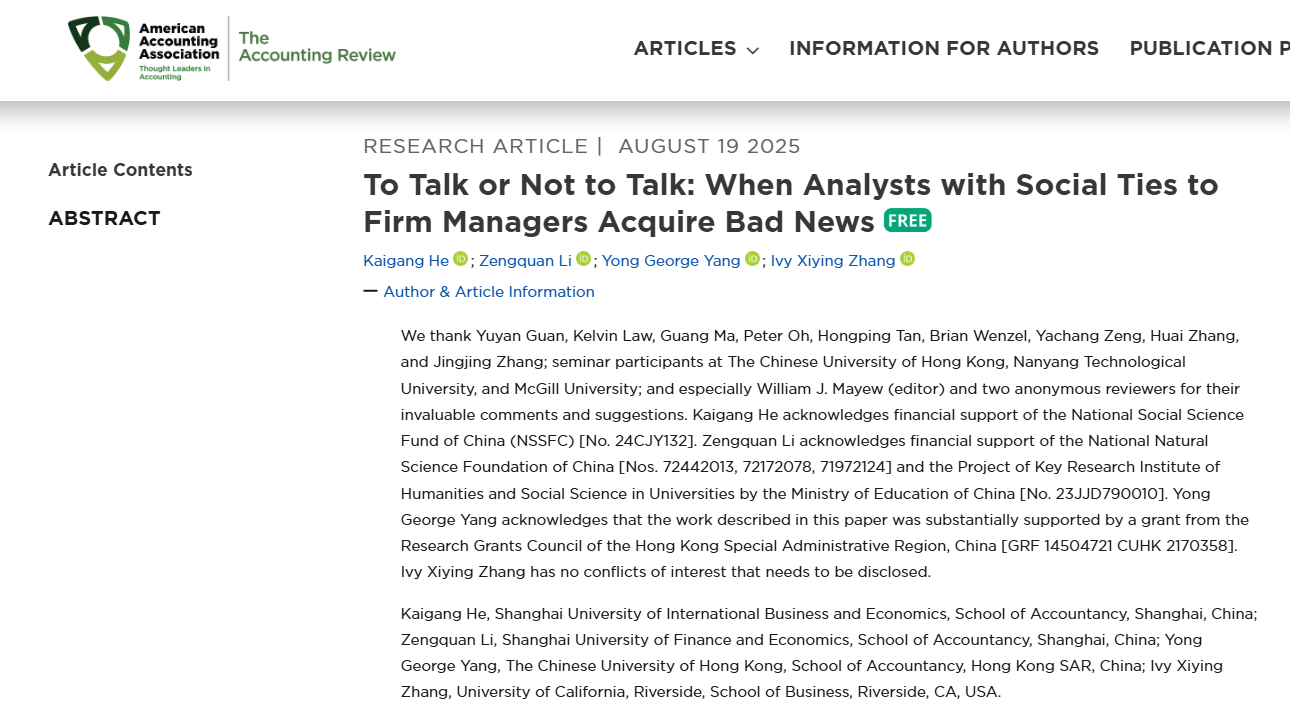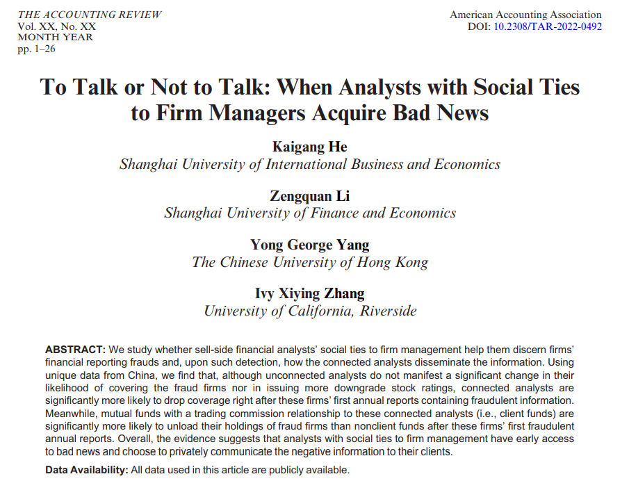 近期,我校會(huì)計(jì)學(xué)院何開剛副教授與其研究團(tuán)隊(duì)合作撰寫的《To Talk or Not to Talk: When Analysts with Social Ties to Firm Managers Acquire Bad News》一文發(fā)表于《The Accounting Review》。《The Accounting Review》雜志創(chuàng)刊于1926年,由美國會(huì)計(jì)學(xué)會(huì)(AAA)主辦,是會(huì)計(jì)學(xué)領(lǐng)域最具影響力的三大頂級(jí)期刊之一,被列入UTD24國際頂尖商學(xué)期刊目錄,被我校列為國際一類期刊。