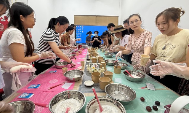 活動現(xiàn)場氣氛熱烈,老師們在專業(yè)師傅的指導下,親手制作冰皮月餅。從和面、包餡到壓模成型,大家興致盎然,互相交流制作心得,現(xiàn)場歡聲笑語不斷。一個個精致可口的月餅不僅傳遞了節(jié)日的甜蜜,也凝聚了同事之間的協(xié)作與情誼。